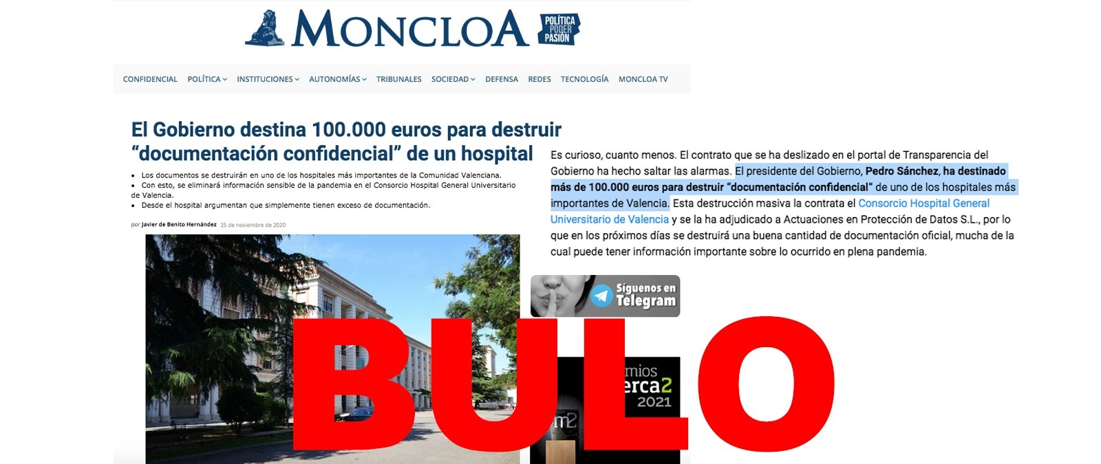 Nos habéis preguntado a través de nuestro chatbot de WhatsApp (+34 644 229 319) por un contenido de la web Moncloa.com que dice que el Gobierno de Pedro Sánchez ha destinado 100.000 euros para destruir "documentación confidencial" en el Consorcio Hospital General Universitario de Valencia (CHGUV). También, que la empresa adjudicataria hará "desaparecer informes que podrían ser útiles" sobre la gestión de la pandemia. Pero es un bulo que el Gobierno central haya destinado ese presupuesto para destruir documentación clínica del CHGUV. Además, no hay pruebas de que se vaya a eliminar información sobre la gestión de la pandemia en este hospital.