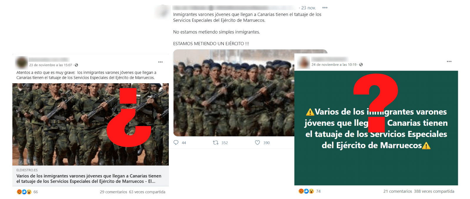 Nos habéis hecho llegar a nuestro chatbot de WhatsApp (+34 644 229 319) imágenes y publicaciones en las que se afirma que “inmigrantes varones jóvenes que llegan a Canarias tienen el tatuaje de los Servicios Especiales del Ejército de Marruecos”. El contenido proviene de una columna de opinión en la web Confilegal, pero no hay publicada ninguna prueba documental de que existan tales tatuajes. Además, la Embajada de Marruecos en España afirma que “ni las fuerzas especiales ni las fuerzas regulares del Ejército marroquí llevan tal distintivo” y Cruz Roja asegura que no tiene constancia de este hecho. Os contamos qué sabemos.