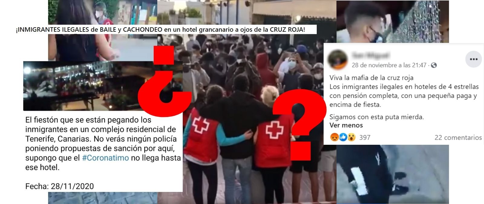 Están circulando varios vídeos en los que se puede ver a un grupo de personas escuchando música y bailando al aire libre, con mascarillas pero sin respetar la distancia social. En dos de esos vídeos se puede ver cómo algunas de estas personas llevan puesta la indumentaria de Cruz Roja. Además, se comparten con comentarios que aseguran que se trata de fiestas con "inmigrantes ilegales" en los hoteles en los que los migrantes están siendo alojados en Canarias.