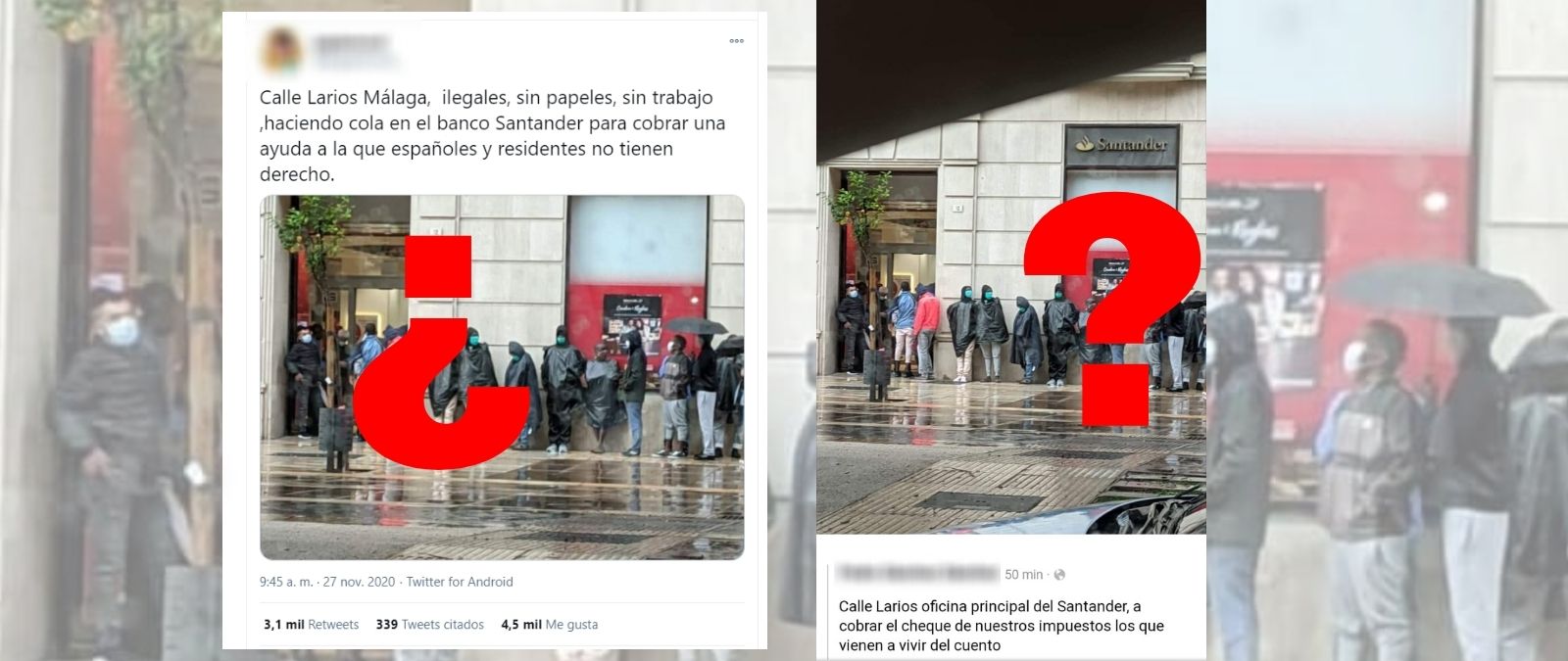 Nos habéis preguntado a través de nuestro chatbot de WhatsApp (+34 644 229 319) por una fotografía de varias personas negras haciendo cola ante una oficina del Banco Santander, asegurando que está tomada en la calle Larios de Málaga. Además, la foto se difunde también en redes sociales con comentarios como "ilegales, sin papeles, sin trabajo, haciendo cola en el Banco Santander para cobrar una ayuda a la que españoles y residentes no tienen derecho".