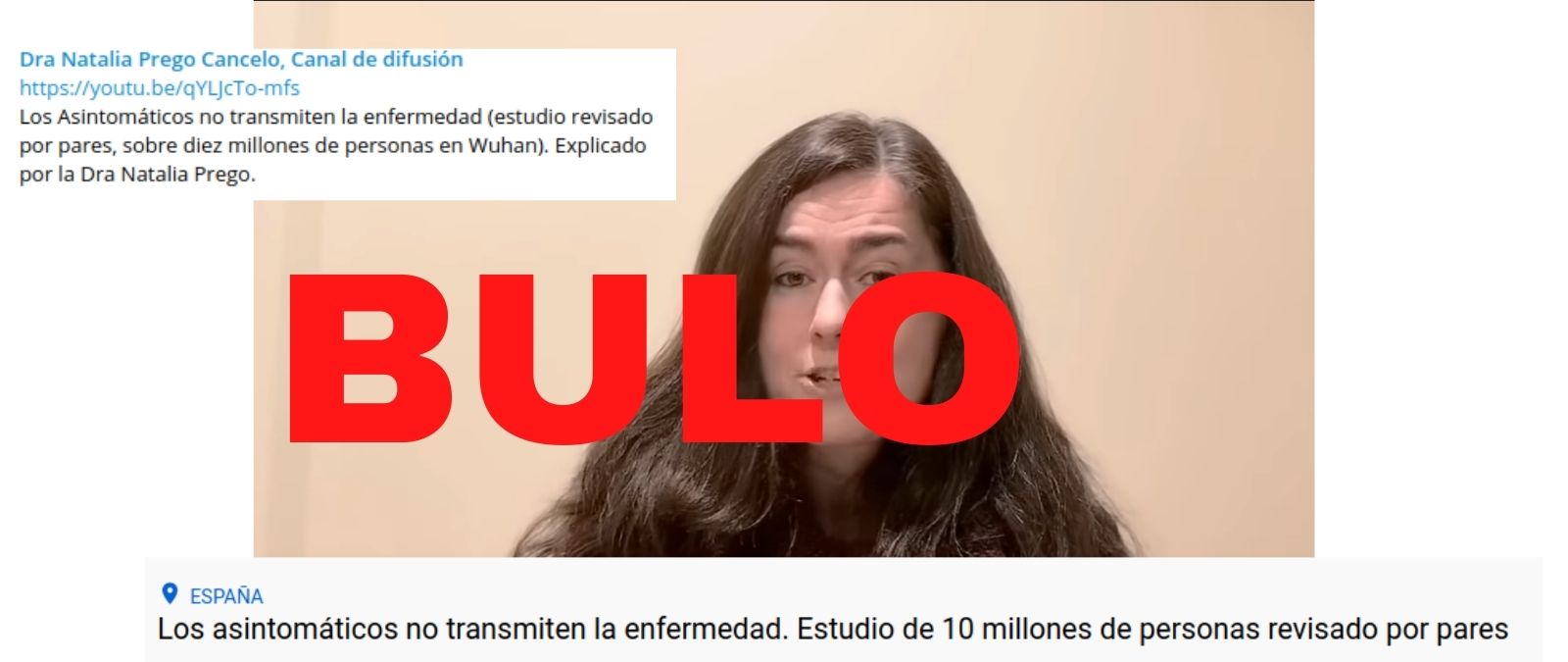 Natalia Prego Cancelo, de la que ya hemos desmentido varios contenidos desinformadores sobre el coronavirus, ha vuelto a compartir un vídeo con afirmaciones falsas. Esta vez, con el título 'Los Asintomáticos no transmiten la enfermedad. Estudio de 10 millones de personas revisado por pares', Prego usa un estudio publicado en la revista científica Nature para negar que los asintomáticos puedan transmitir la enfermedad. En el minuto 6:50 de su vídeo dice: "Este estudio es un dato más que se aporta para confirmar que los asintomáticos realmente no transmiten la enfermedad COVID-19 aunque sean PCR positivo". Pero es un bulo: el estudio no dice que los asintomáticos no transmiten el coronavirus y hay otros estudios que sí concluyen que estas personas pueden contagiar.