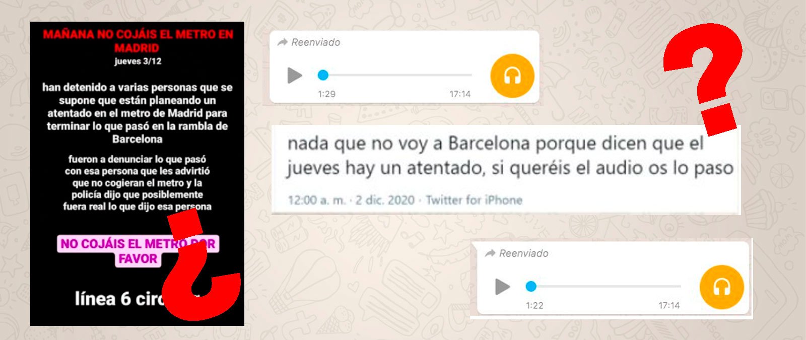 Uno de los audios dice que va a haber "un atentado terrorista en el metro de Madrid". Además, la imagen que circula dice que "han detenido a varias personas que se supone que están planeando un atentado en el metro de Madrid para terminar lo que pasó en la rambla de Barcelona".