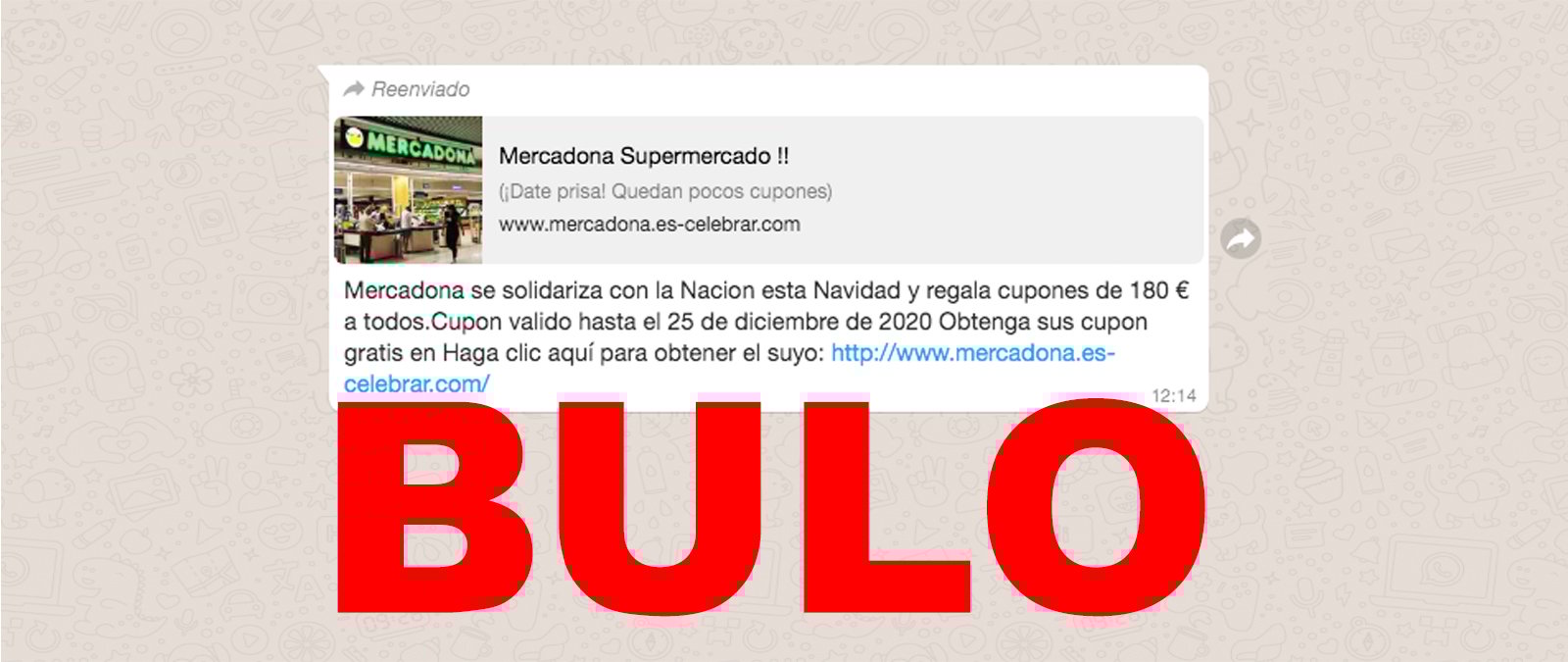 Nos habéis mandado a nuestro chatbot de WhatsApp (+34 644 22 93 19) una cadena que dice que Mercadona se ha solidarizado con la nación y que esta Navidad regala cupones de 180 euros válidos hasta el 25 de diciembre. El mensaje circula con dos enlaces diferentes donde supuestamente puedes obtener el tuyo (con la palabra "coupon" y con la "celebrar"). Es un bulo: es un caso de phishing, una técnica que utilizan timadores para intentar hacerse con tus datos personales.