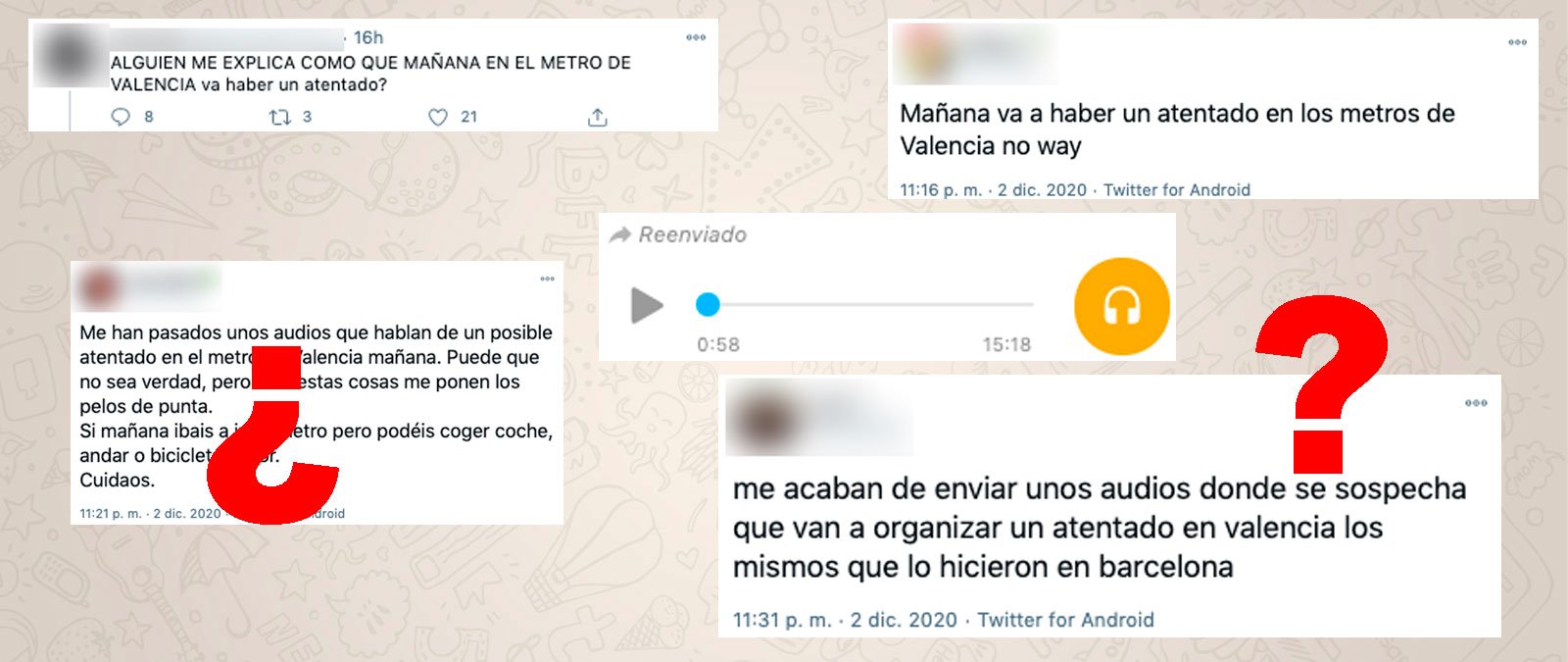 El audio empieza asegurando que una "prima que está saliendo con un guardia civil" le había dicho lo de la supuesta alerta de atentado en Valencia. En Maldita.es ya os contamos que con frecuencia nos preguntáis por audios de este tipo que circulan a través de WhatsApp y que utilizan este tipo fórmulas, como "alguien me ha dicho" o esto le ha pasado "al amigo de un amigo". Ya entonces os dijimos que en casos como estos, sospecha si un audio usa este tipo de frases, si utiliza "a las autoridades" para apoyar una falsa advertencia, si pide difusión, si son anónimos, sin son muy alarmistas o aquellos que no te dicen dónde ni cuándo ha ocurrido.