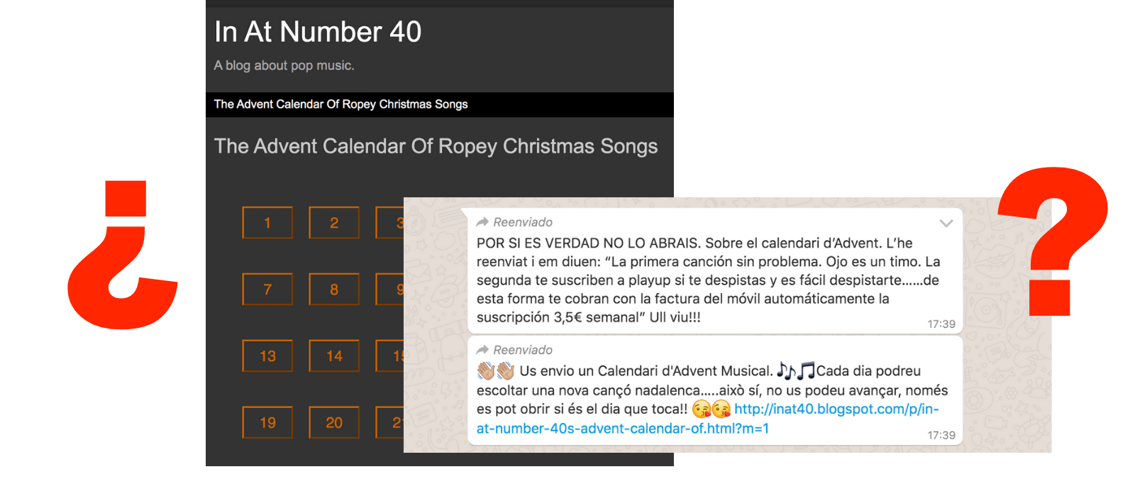 Nos estáis preguntado a través de nuestro chatbot en el +34 644 229 319 por una cadena de WhatsApp en la que se advierte de que al hacer clic sobre el enlace de la segunda canción de un calendario de adviento, enviado a través de otra cadena de WhatsApp en catalán, te suscriben a una playup, un servicio que ofrece radio musical personalizada, y “de esta forma te cobran con la factura del móvil automáticamente la suscripción de 3,5€ semanal”.