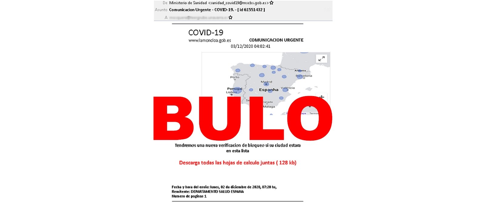 Se están enviando correos electrónicos, supuestamente desde el Ministerio de Sanidad, Consumo y Bienestar Social, en los que se dice que puedes consultar cuáles son las restricciones perimetrales por la pandemia de COVID-19 que afectan a tu ciudad. Adjuntan un enlace para que descargues unas "hojas de cálculo" con la lista de las ciudades que tienen algún "bloqueo". Cuidado porque es un bulo. La Oficina de Seguridad del Internauta (OSI) ha advertido de que se trata de phishing y ha explicado que, si pinchas en la URL, se te descarga malware en tu dispositivo.