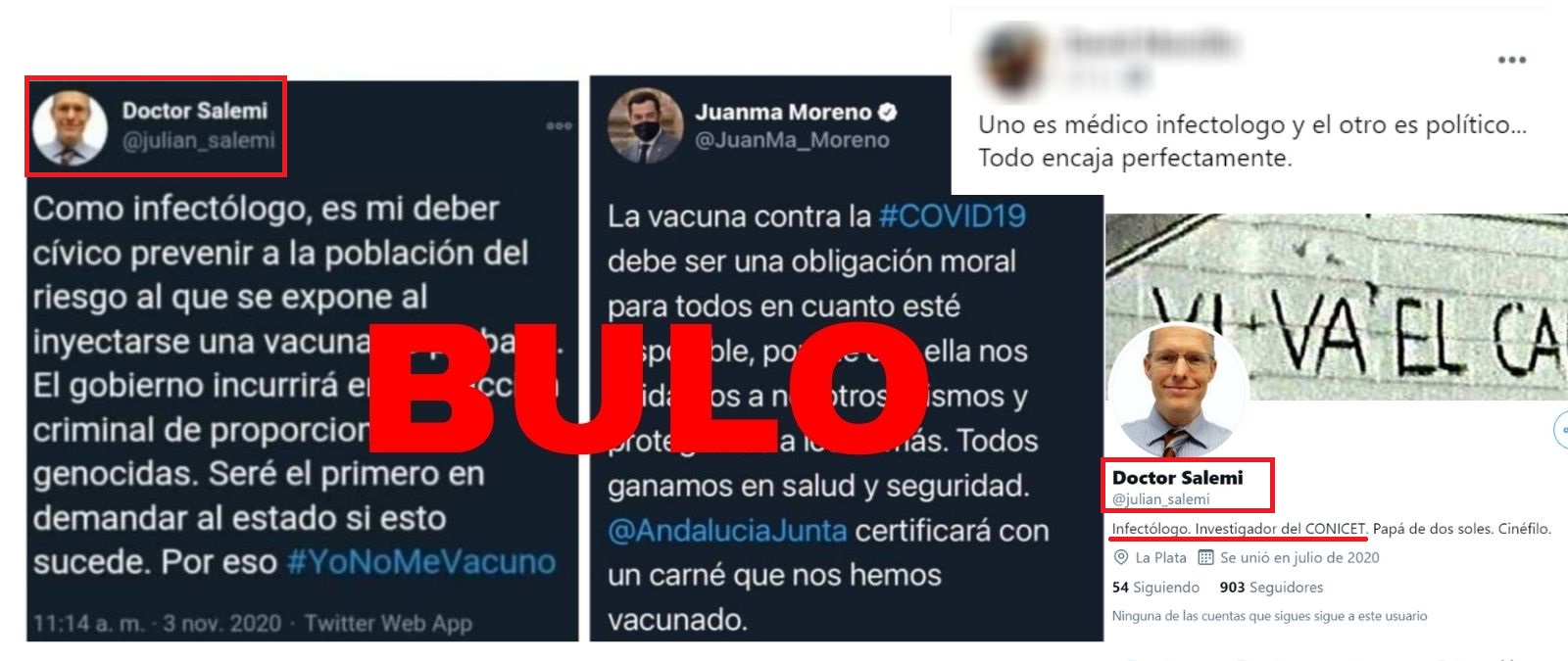 Circula una captura de un tuit del presidente de la Junta de Andalucía, Juanma Moreno, junto a otra del tuit de un supuesto infectólogo e investigador del Consejo Nacional de Investigaciones Científicas y Técnicas de Argentina (Conicet) que se llamaría Julian Salemi. El tuit de Salemi dice que su deber cívico es "prevenir a la población al riesgo al que se expone al inyectarse una vacuna no probada" mientras que el de Juanma Moreno dice que "la vacuna contra la COVID19 debe ser una obligación moral para todos". Las capturas se mueven con el comentario "uno es médico infectólogo y el otro es político... Todo encaja perfectamente". Sin embargo, la cuenta que se hace llamar doctor Salemi no es la de un investigador del Conicet. Además, las vacunas autorizadas contra la COVID-19 sí han sido probadas a través de ensayos clínicos. *