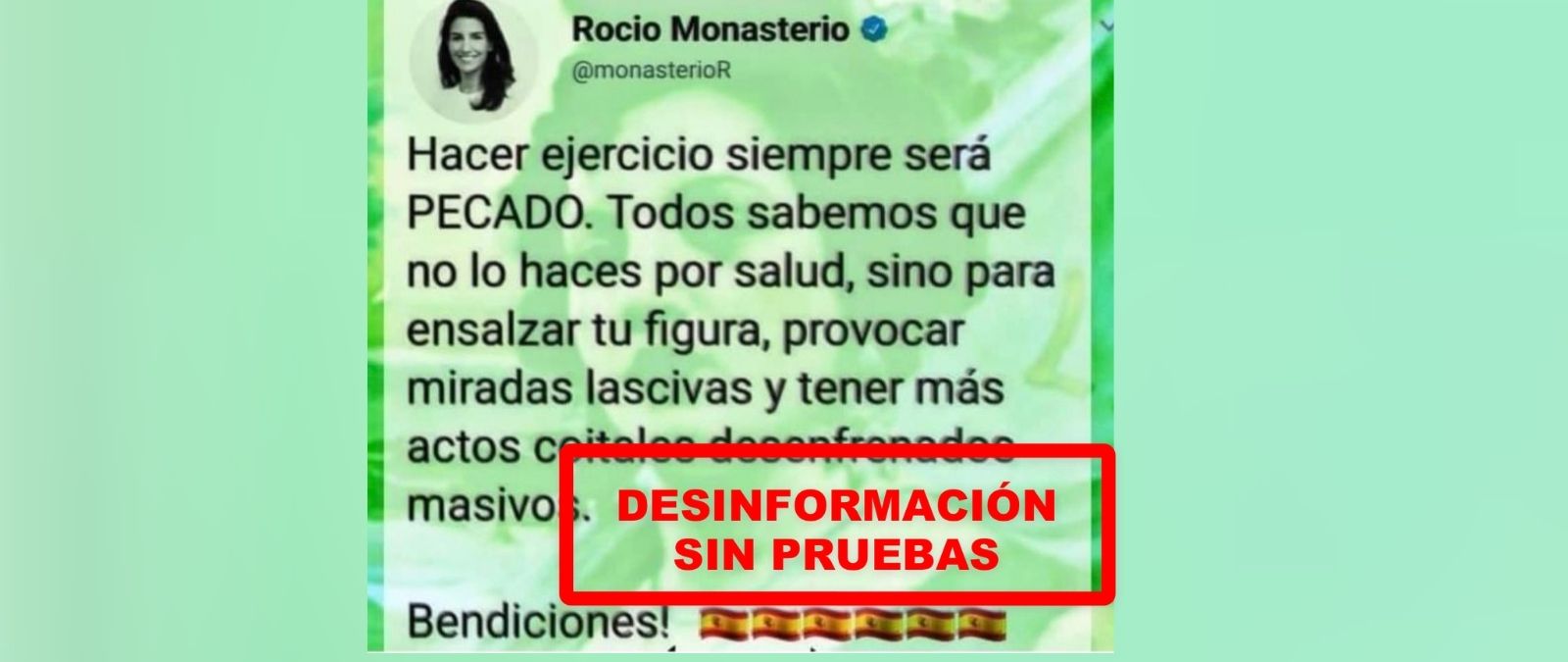 Por lo tanto, como decimos, no hay ninguna prueba de que Rocío Monasterio haya tuiteado que "hacer ejercicio siempre será PECADO".