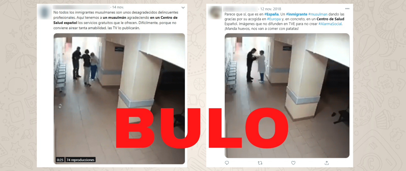 Por lo tanto, es un bulo que la agresión del vídeo la realice un "inmigrante musulmán" en un centro de salud de España. Se trataba de un hombre ebrio y fue grabado en la ciudad rusa de Novgorod en el año 2017.