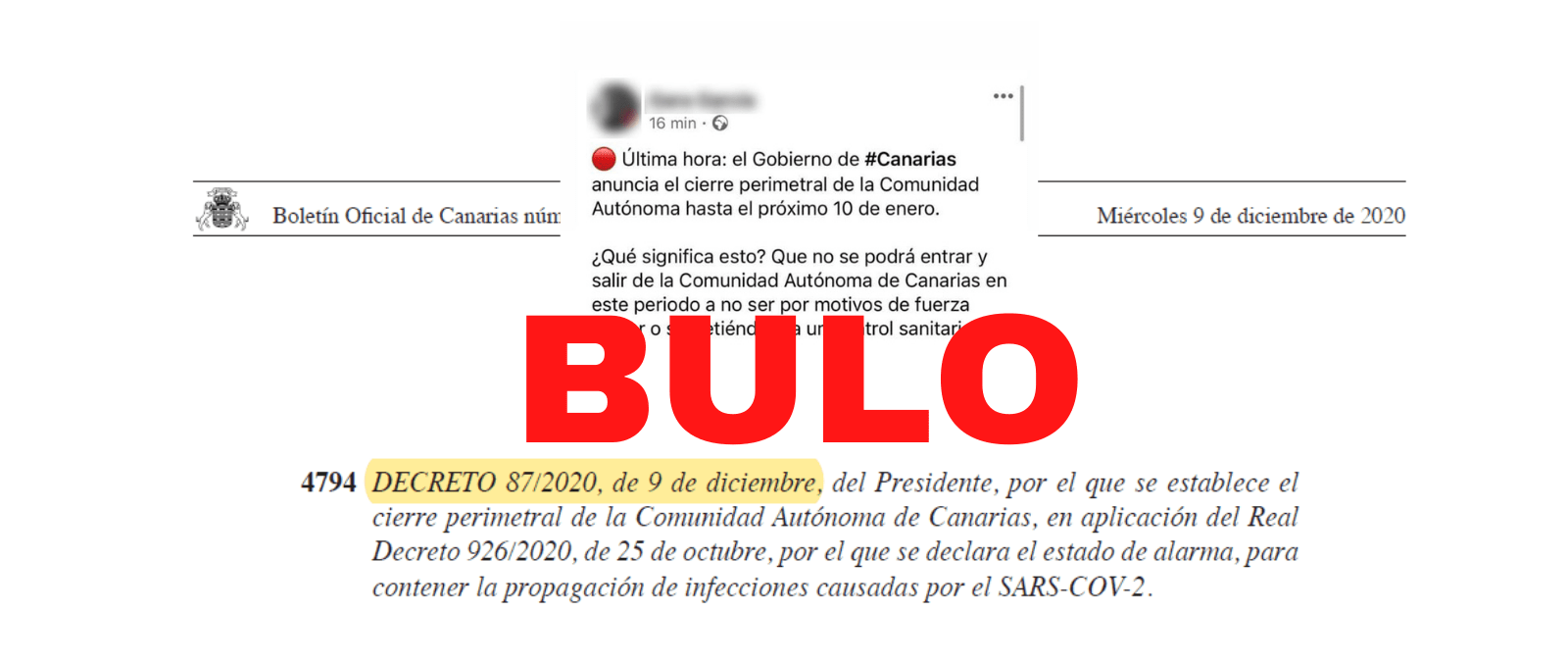 Con la aprobación por parte del Gobierno de Canarias del Decreto 87/2020 del 9 de diciembre y su entrada en vigor, está circulando un contenido que afirma que “Canarias permanecerá cerrada perimetralmente hasta el próximo 10 de enero”. Es un bulo. La comunidad regulará la llegada de viajeros internacionales a través de un control sanitario, pero no impide su entrada. Te lo explicamos.