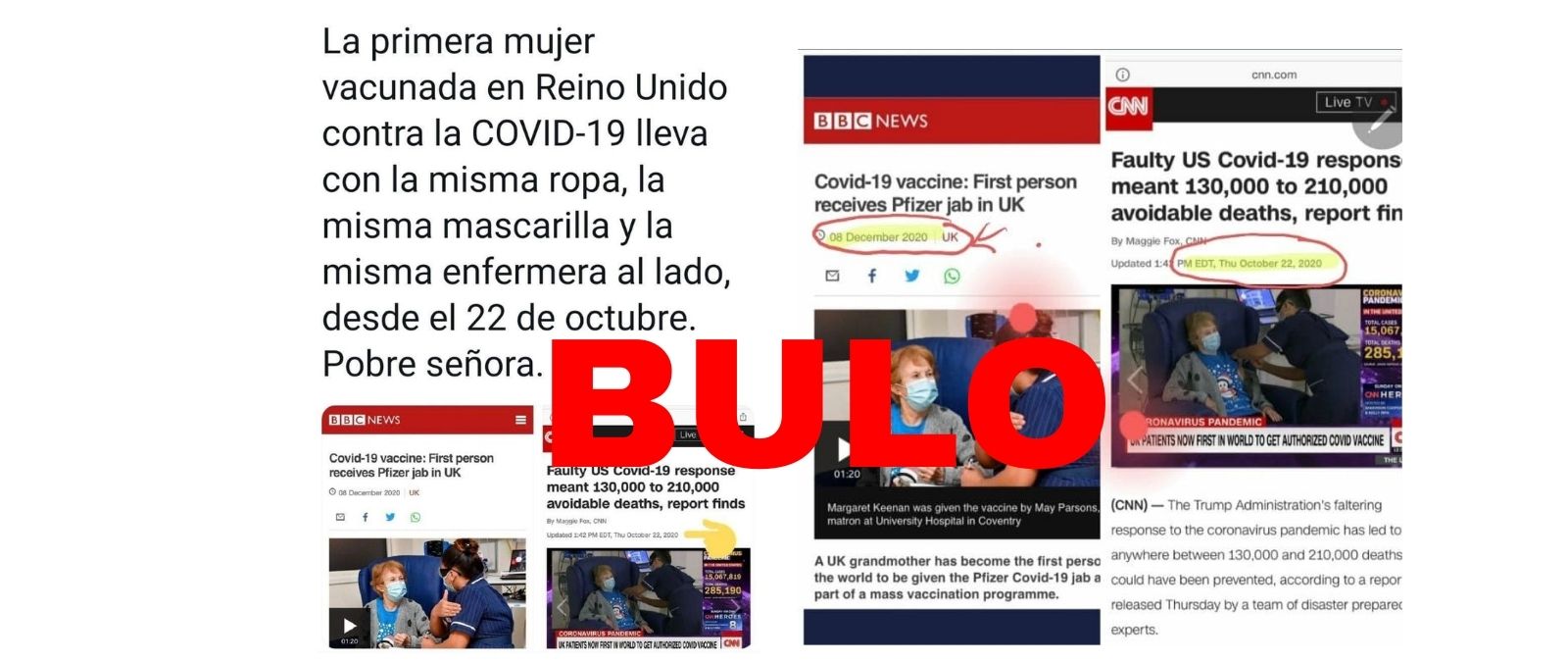 Nos habéis preguntado a través de nuestro chatbot de WhatsApp (+34 644 229 319) por una captura que compara una publicación del 8 de diciembre de la BBC con otra del 22 de octubre de la CNN. En ambas se puede ver, debajo del titular, una imagen de Margaret Keenan, la primera mujer vacunada contra el coronavirus en Reino Unido. El texto que incluye la imagen dice que "lleva con la misma ropa, la misma mascarilla, y la misma enfermera al lado, desde el 22 de octubre". Es un bulo. La imagen de CNN corresponde a un vídeo emitido por la cadena después de que Keenan recibiera la vacuna el 8 de diciembre, aunque aparezca en otras publicaciones de su web, tanto más antiguas como posteriores.