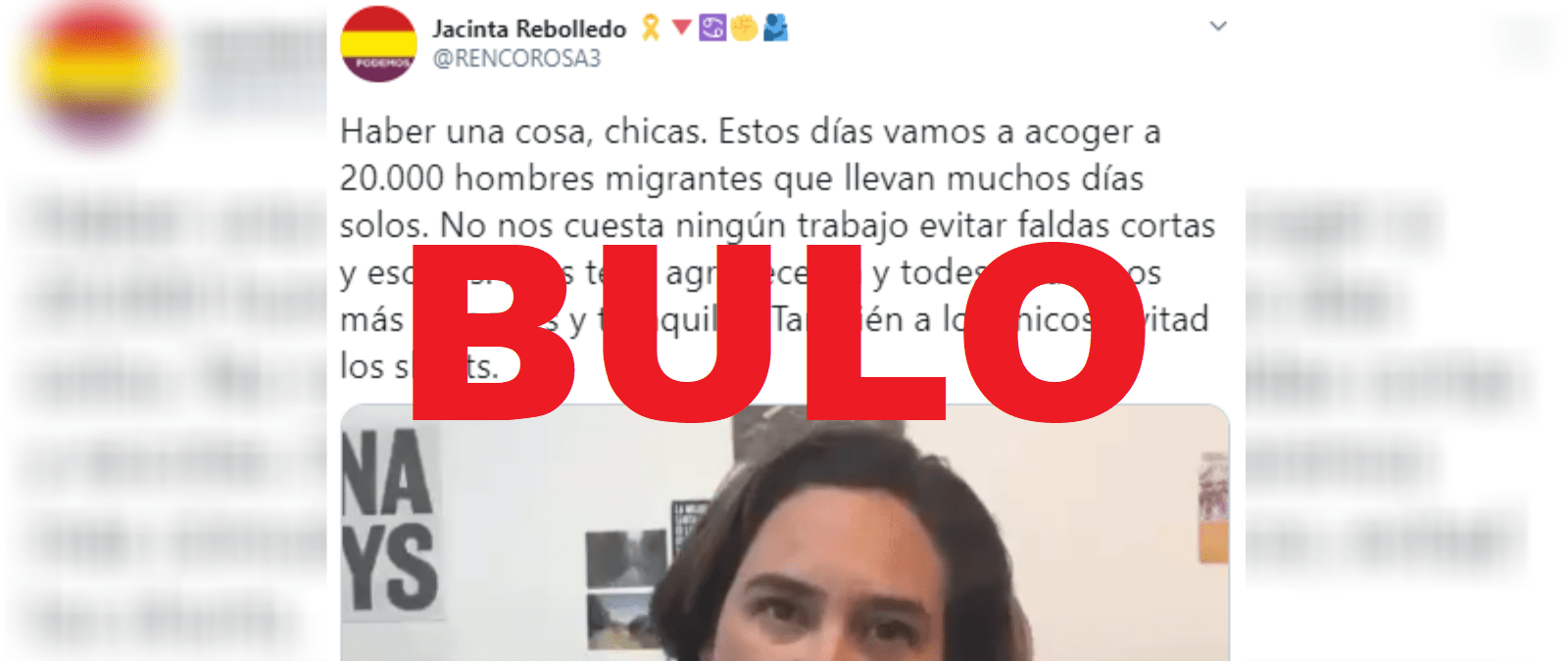Nos habéis preguntado por una captura de un tuit que circula en redes sociales junto a la imagen de la alcaldesa de Barcelona, Ada Colau. El mensaje dice que "estos días vamos a acoger a 20.000 hombres migrantes que llevan muchos días solos" y que "no nos cuesta ningún trabajo evitar faldas cortas y escotes. Ellos te lo agradecerán y todes estaremos más cómodes y tranquilas [sic.]". Es un bulo: la cuenta de Twitter de Jacinta Rebolledo (@rencorosa3), quien ha escrito el tuit, es una cuenta troll y se ha viralizado en las redes sociales como si fuera el perfil real de una persona de Podemos.