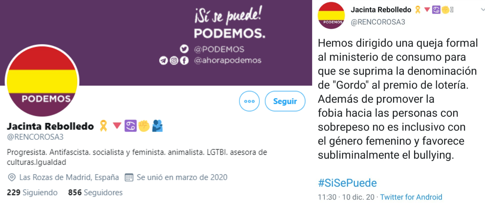 Uno de los mensajes publicados por la cuenta de Twitter de Jacinta Rebolledo (@rencorosa3) es este en el que afirma que "ha dirigido al Ministerio de Consumo una queja formal para que se suprima la denominación «Gordo» al premio de la lotería" por "promover la fobia a las personas con sobrepeso" y porque "no es inclusivo con el género femenino". De hecho, este comentario se ha viralizado como si lo hubiera dicho un perfil real de Podemos pero es un bulo.