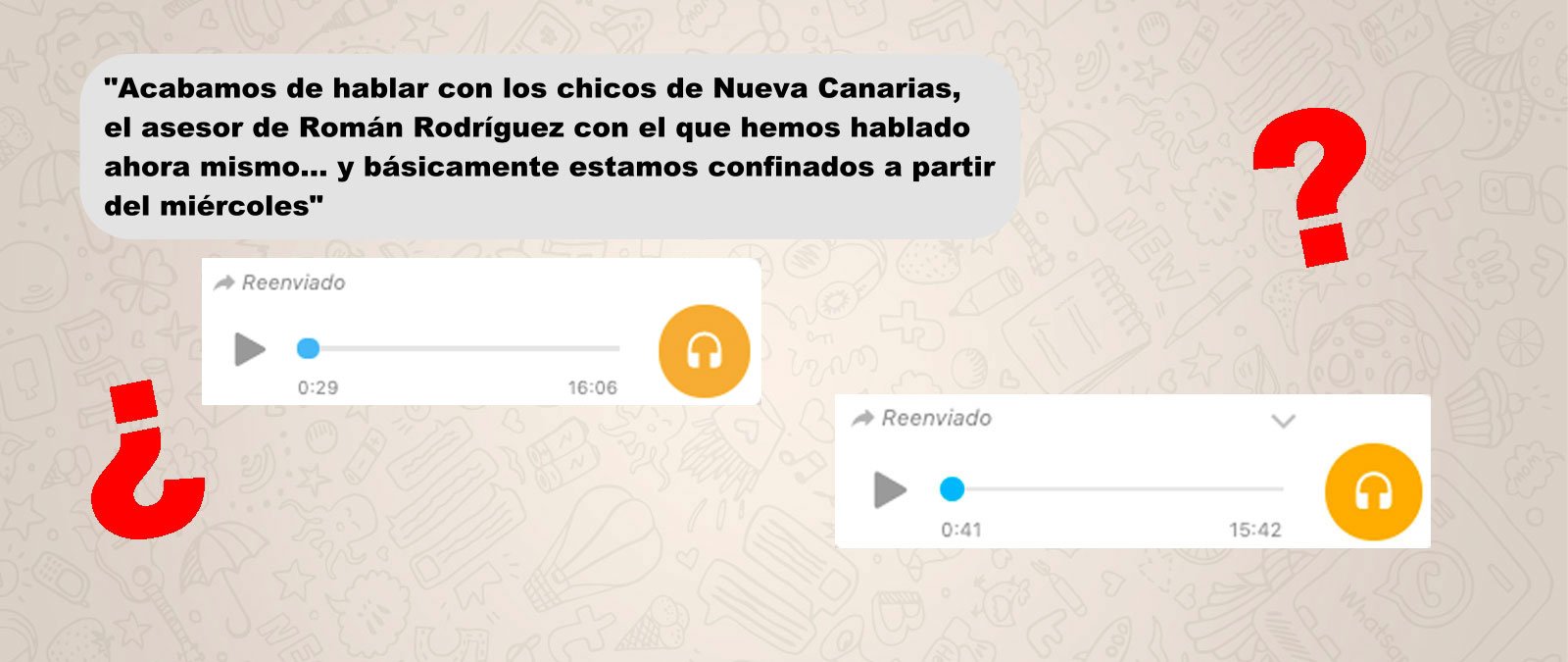 "Acabamos de hablar con los chicos de Nueva Canarias, el asesor de Román Rodríguez (vicepresidente de Canarias) con el que hemos hablado ahora mismo... y básicamente estamos confinados a partir del miércoles". Eso dice uno de los audios de WhatsApp por el que nos habéis preguntado sobre un supuesto nuevo confinamiento que el Gobierno de Canarias va a decretar "a partir de esta semana o de principios de la semana que viene". Tanto esta grabación como otra versión que dice que ese confinamiento se va a producir en Tenerife son "bulos", según nos dicen desde la Consejería de Sanidad del archipiélago a fecha de 16 de diciembre de 2020 a las 15:10.