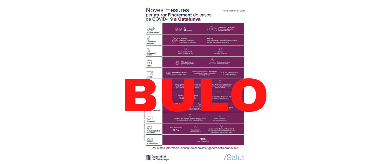Durante las últimas horas ha circulado por grupos de WhatsApp y redes sociales una imagen que anuncia "nuevas medidas para detener el incremento de casos de COVID-19 en Cataluña". Pero es un bulo que esa infografía sea un comunicado oficial de la Generalitat. Tanto el Govern como el Departamento de Salud lo desmienten en sus redes sociales. La imagen se comparte con fecha del 17 de diciembre, pero ese día aún no se habían anunciado de forma oficial las nuevas restricciones para Navidad: la rueda de prensa donde se anunciaron se realizó el 18 de diciembre de 2020 a las 9 de la mañana. Además, muchas de las medidas que aparecen en la imagen viral no corresponden con las finalmente anunciadas por la Generalitat en rueda de prensa.