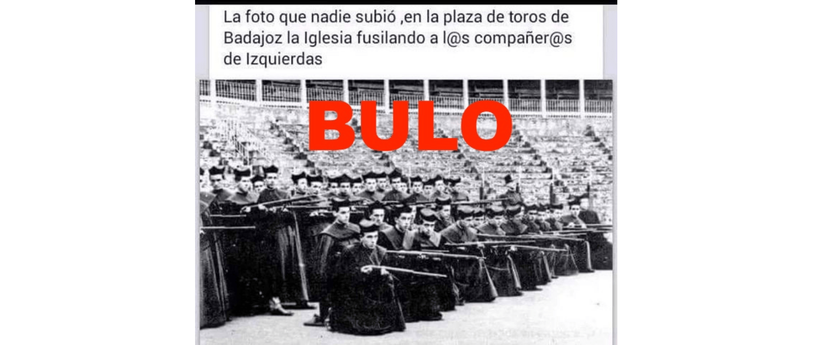 “La foto que nadie subió, en la plaza de toros de Badajoz la Iglesia fusilando a l@s compañer@s de izquierdas”: este es el texto que acompaña a la imagen en la que aparecen una multitud de seminaristas empuñando un arma y por la que nos habéis preguntado a través de nuestro chatbot de WhatsApp (+34 644 229 319). Pero es un bulo. La imagen fue tomada en la antigua plaza de toros de Pamplona en un período anterior a la Segunda República (1931-1936) y a la Guerra Civil (1936-1939).