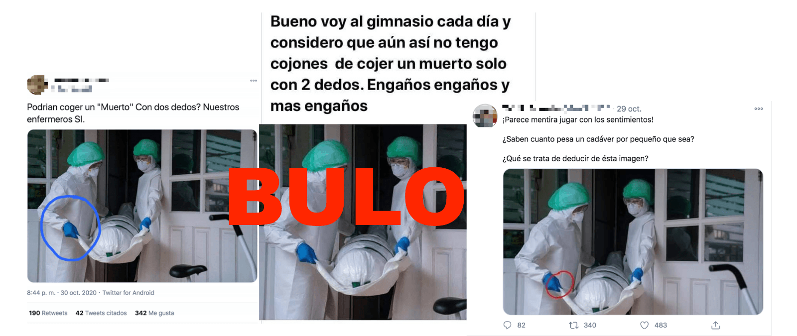 Nos estáis preguntando por nuestro chatbot de WhatsApp en el +34 644 229 319 sobre una imagen en la que aparecen dos enfermeras cogiendo a un supuesto muerto por coronavirus. Según el texto que acompaña a esta imagen, la cual se ha viralizado en redes sociales, toda esta situación de pandemia sería un "engaño", ya que estas enfermeras están cogiendo al fallecido “con dos dedos”. Pero es un bulo.