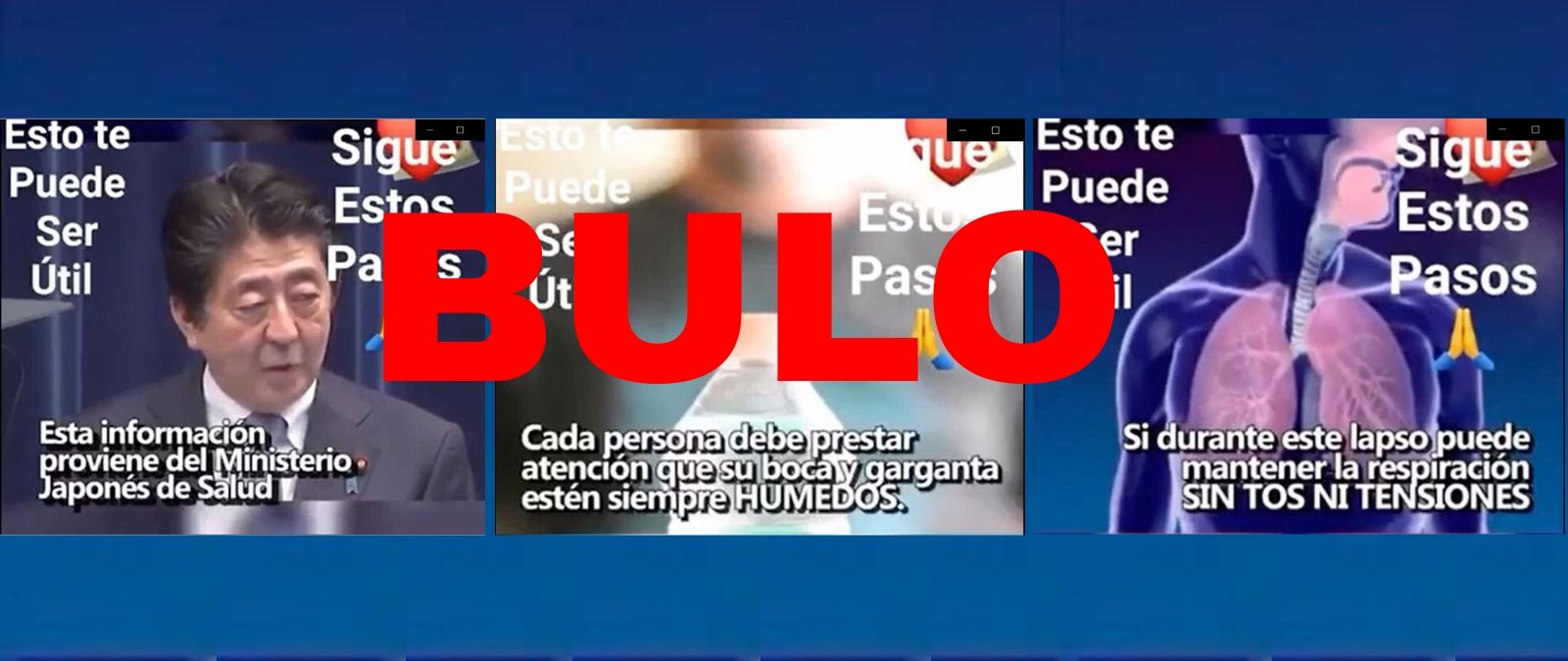 Estáis volviendo a preguntarnos por un vídeo con texto que dice ofrecer información sobre el coronavirus que "proviene del Ministerio Japonés de Salud". Afirma que cuando aparecen los primeros síntomas de la infección, los pulmones ya muestran un 50% de fibrosis. También dice que "los expertos de Taiwán" recomiendan respirar profundamente y retener el aire durante diez segundos para saber si estamos infectados y que beber agua cada 15 minutos o hacer gárgaras con agua tibia y sal mata al virus. Es un bulo. El vídeo incluye contenidos que han circulado antes y que desde Maldita.es ya hemos desmentido. Os lo contamos.