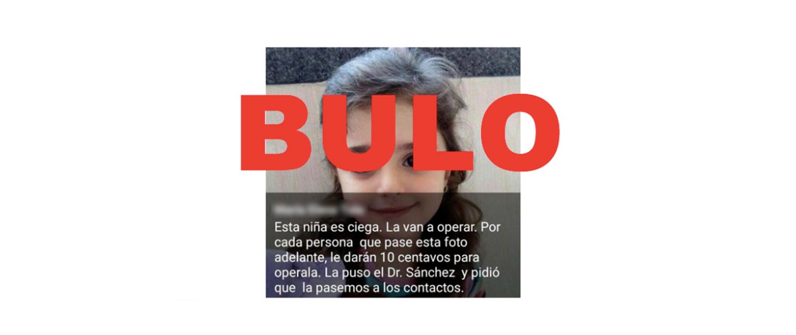 Vuelve a moverse la foto de una niña "ciega" a la que supuestamente van a operar en la que se asegura que por cada vez que sea difundida se recaudarán "10 centavos". Es un bulo que ya desmentimos hace un tiempo en Maldita.es pero que ha vuelto a circular en los últimos días.