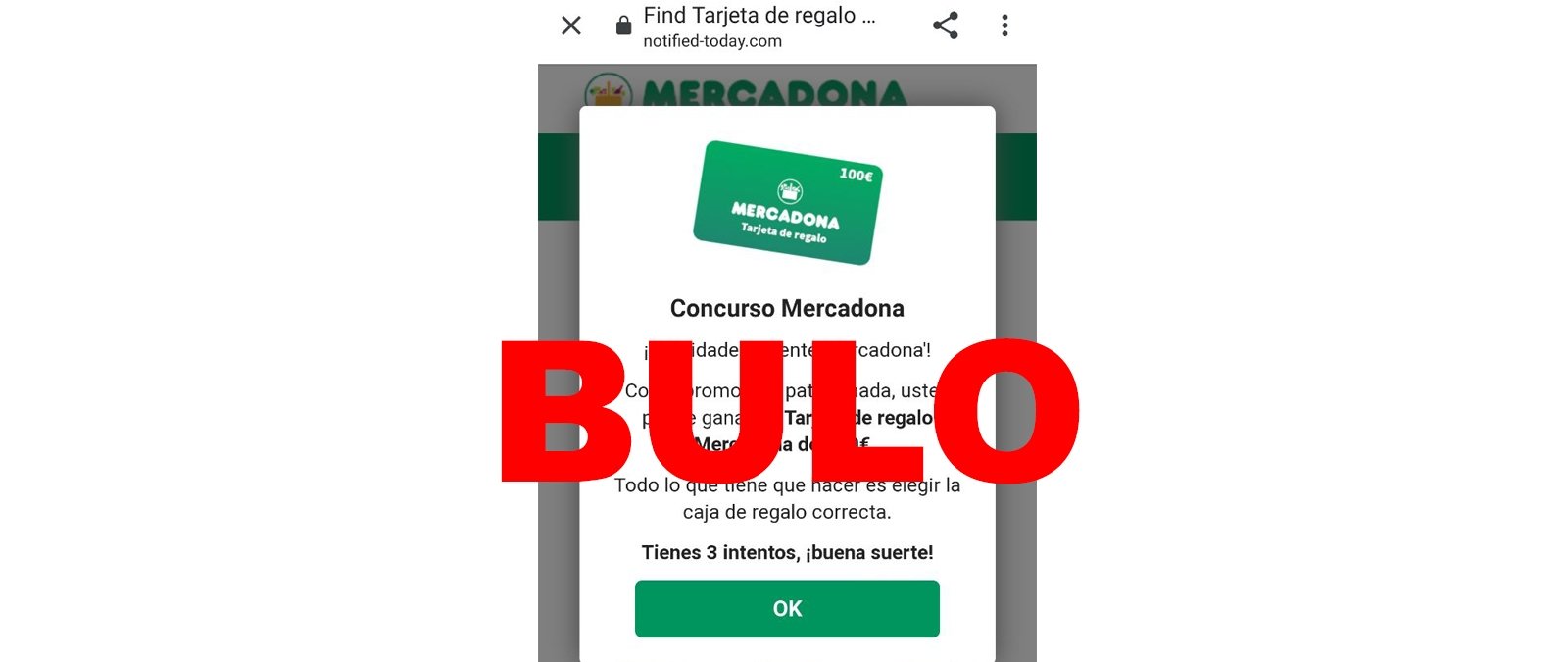 Una web te dice que has sido seleccionado para participar en un concurso para ganar una tarjeta regalo de Mercadona de 100 euros. Es un bulo, es un caso de phishing, una técnica que utilizan timadores para intentar hacerse con tus datos personales suplantando la identidad de una empresa o institución que conoces.