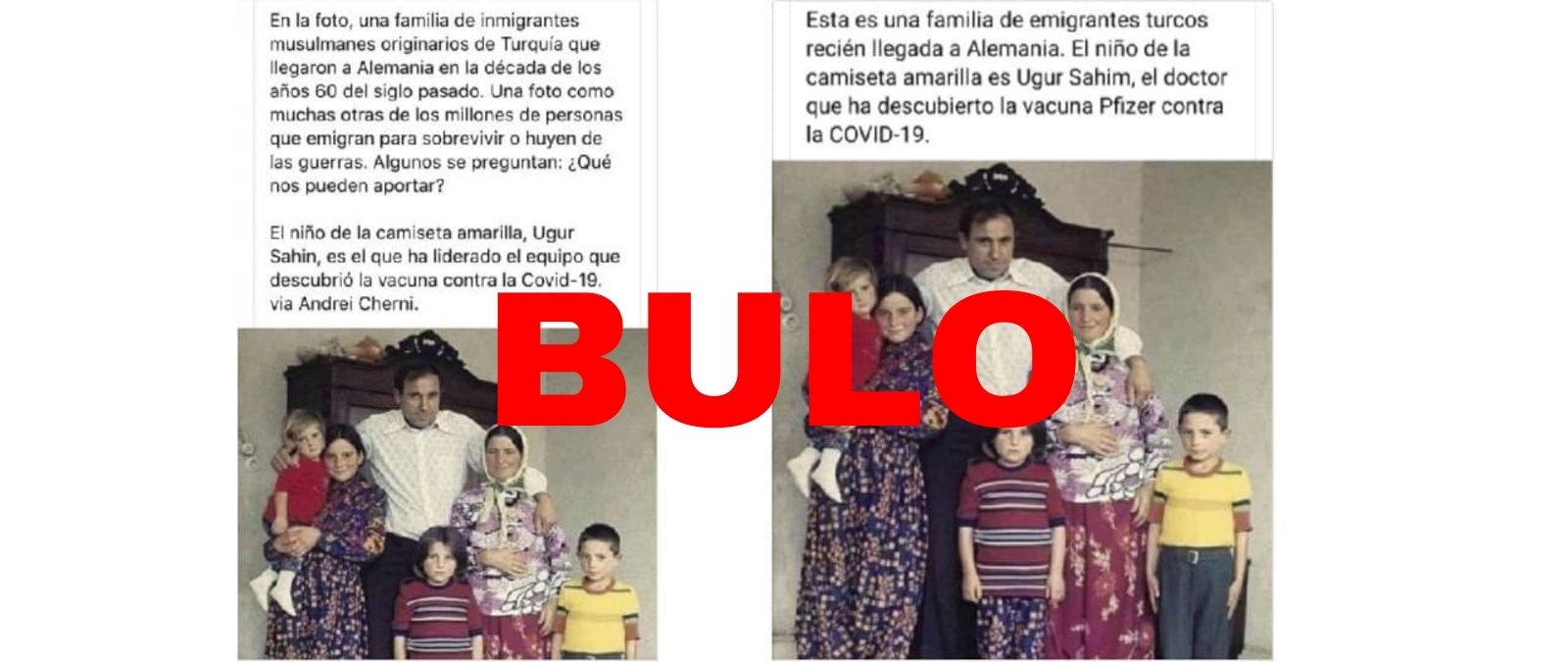 Nos estáis preguntando a través de nuestro chatbot de WhatsApp (+34 644 229 319) por una imágen que está circulando estos días en redes sociales, en la que supuestamente aparece Ugur Sahin, el cofundador de BioNTech, empresa que ha desarrollado la investigación de la vacuna contra la COVID-19 junto con la farmacéutica Pfizer, de pequeño junto con su familia, “inmigrantes musulmanes originarios de Turquía que llegaron a Alemania en la década de los años 60 del siglo pasado”.