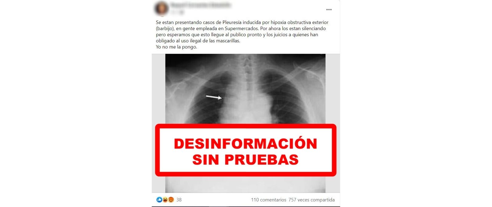 Circulan contenidos que aseguran que "se están presentando casos de pleuresía inducida por hipoxia" debido al uso de la mascarilla. Al texto lo acompaña la radiografía de un tórax en el que se pueden ver los pulmones de una persona. Pero no hay pruebas de que se estén dando estos casos. Además, la imagen que usa no tiene nada que ver con el coronavirus y no hay evidencias de que las mascarillas causen hipoxia.