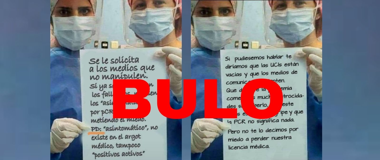 Está circulando una foto en la que dos sanitarias sostienen y muestran a cámara un cartel. Nos habéis preguntado por dos versiones de la misma imagen, con textos diferentes en el papel. Se trata de una foto que ha sido manipulada en más de una ocasión para lanzar afirmaciones falsas sobre la COVID-19 como que los asintomáticos no existen, que este coronavirus es como la gripe y que la PCR no significa nada.