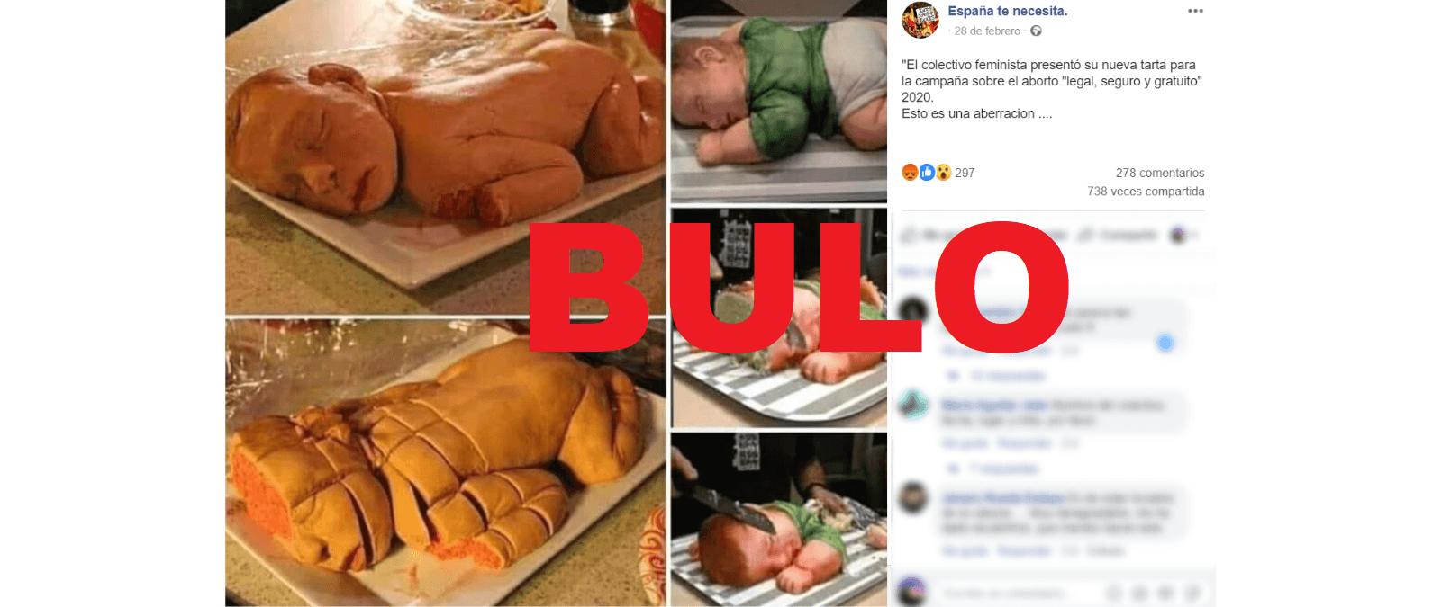 Nos habéis preguntado por una publicación de Facebook en la que se dice que "el colectivo feminista presentó su nueva tarta para la campaña sobre el aborto «legal, seguro y gratuito» 2020" con dos tartas de un bebé troceado que se mueve como si fuera España. Es un bulo.