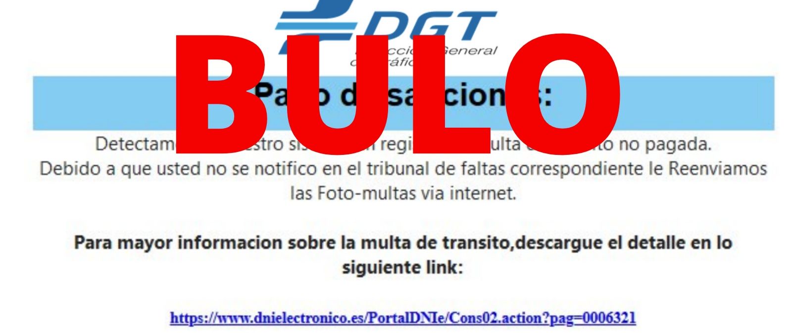 También están enviando un correo suplantando a la DGT con el siguiente mensaje "Detectamos en nuestro sistema un registro de multa de transito no pagada" (sic) y con un link distinto al correo que hemos mencionado. Según la Policía Nacional, se trata de un archivo malicioso "que suplanta a la DGT con el objetivo de difundir un malware".
