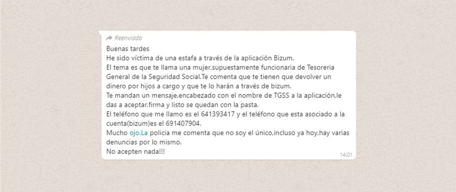 El año pasado, el Grupo de Delitos Telemáticos de la Guardia Civil (GDT) ya alertó de que había una "oleada de ciberestafas" a través de apps como Bizum desde su cuenta oficial de Twitter. "Contactan mediante whatsapp, e-mail o llamada alegando una devolución pendiente de la Seguridad Social. Realmente intentarán realizarnos un cobro. Ninguna entidad pública hace reintegros por este medio", explicaron.