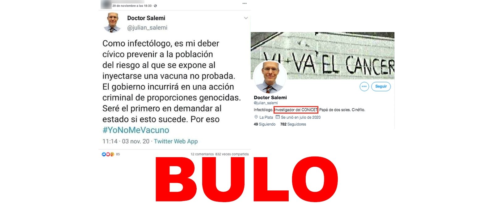 Se está moviendo por redes sociales un tuit de un supuesto infectólogo e investigador del Consejo Nacional de Investigaciones Científicas y Técnicas de Argentina (Conicet) llamado Julian Salemi. "Como infectólogo, es mi deber cívico prevenir a la población del riesgo al que se expone al inyectarse una vacuna no probada. El gobierno incurrirá en una acción criminal de proporciones genocidas", afirma en el tuit. Sin embargo, es un bulo que el supuesto doctor Salemi sea investigador del Conicet.
