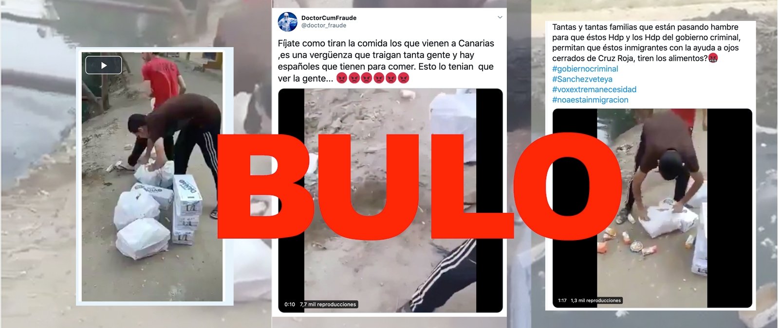 En el vídeo que está circulando, que se difunde en dos versiones, una de 18 segundos y otra de 1 minuto y 31 segundos, se ve a dos hombres abriendo cajas de cartón y bolsas de plástico y tirando los productos a un caudal de agua. Estos vídeos se difunden afirmando que está relacionado con la inmigración en Canarias con mensajes como "el gobierno criminal, permite que estos inmigrantes con la ayuda a ojos cerrados de Cruz Roja, tiren los alimentos". Sin embargo, los productos que se ven en el vídeo, que son de la marca Danone, no están en español, como estarían si fueran de Canarias, sino que están en árabe, como se puede ver en diferentes momentos del vídeo.