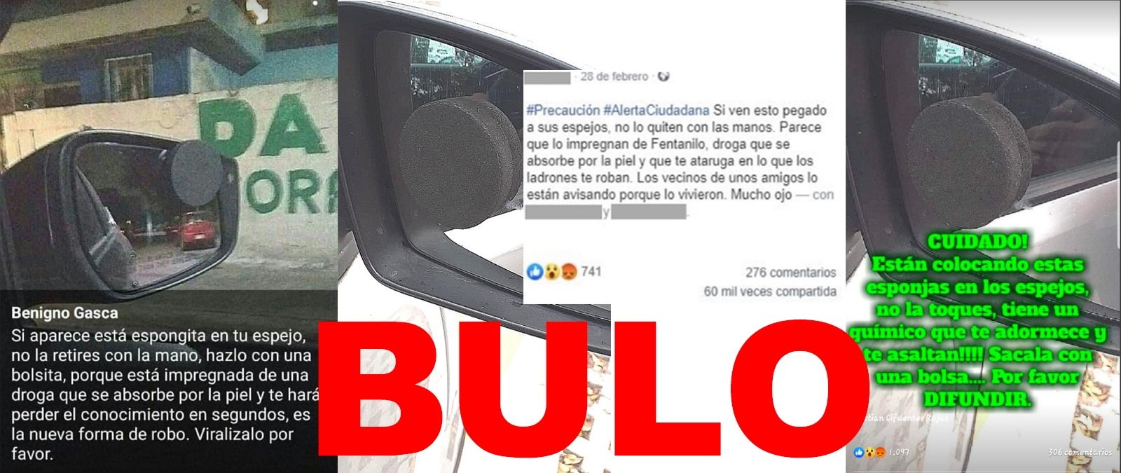 Nos habéis vuelto a preguntar por una foto de una especie de esponja pegada en el retrovisor de un coche que se comparte con este mensaje: "Si ven esto pegado a sus espejos, no lo quiten con las manos. Parece que lo impregnan de fentanilo, droga que se absorbe por la piel y que te ataruga en lo que los ladrones te roban". En Facebook una publicación que alerta de esto ha sido compartida 60.000 veces. Pero es un bulo: la Guardia Civil no tiene constancia de ello y la Policía Nacional asegura que no tiene "ninguna respuesta positiva de que esto exista".