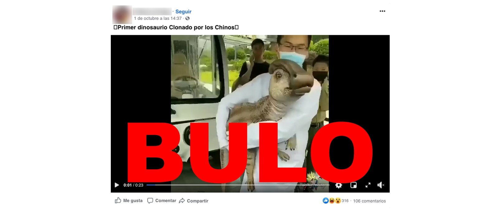 Está circulando por redes sociales un vídeo en el que vemos a una persona con bata blanca cargar en sus brazos a un dinosaurio pequeño. Se comparte con comentarios que afirman que el dinosaurio es real y que ha sido "clonado por los chinos". Pero es un bulo. El dinosaurio forma parte de una exposición de Jurassic Park.
