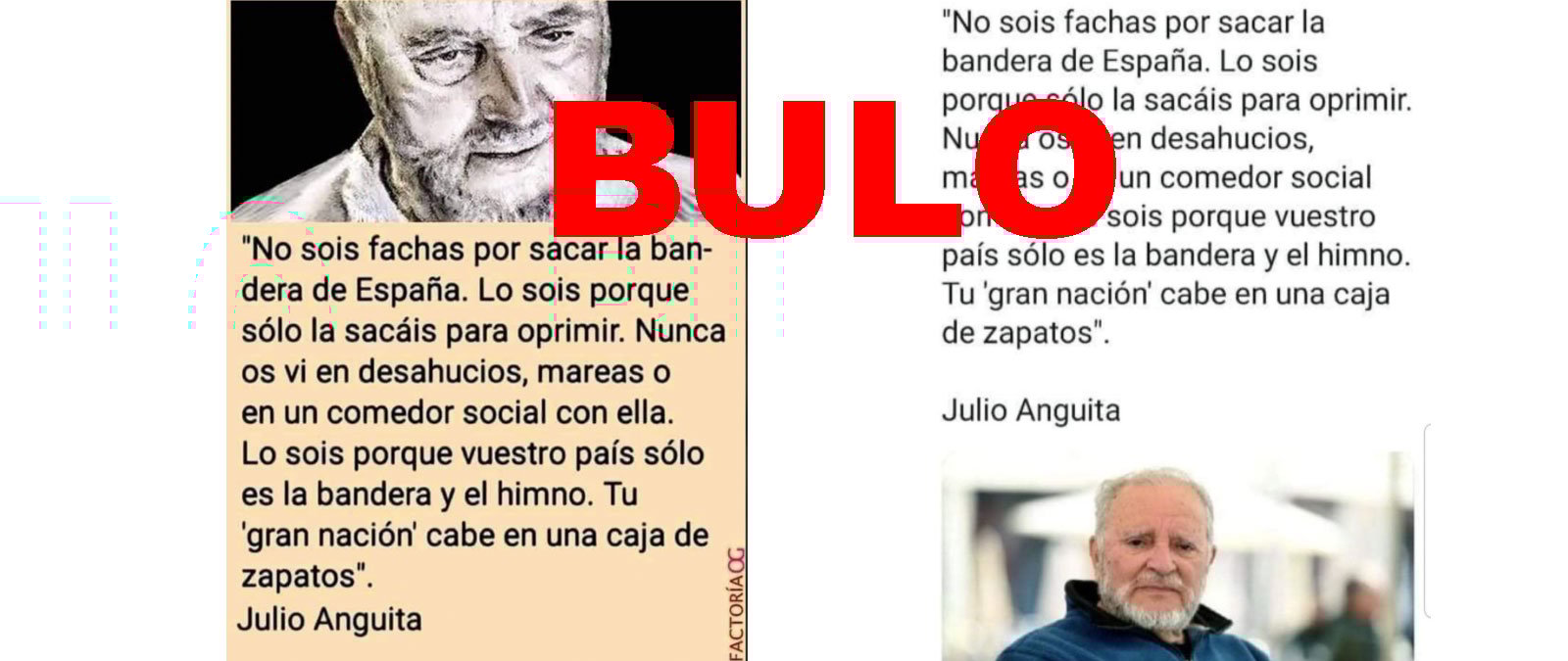 Desde al menos el 12 de octubre de 2017 se atribuye al ex secretario general del Partido Comunista de España (PCE) y ex coordinador general de Izquierda Unida (IU), Julio Anguita, la siguiente frase: "No sois fachas por sacar la bandera de España. Lo sois porque sólo la sacáis para oprimir. Nunca os vi en desahucios, mareas o en un comedor social con ella. Lo sois porque vuestro país sólo es la bandera y el himno. Tu 'gran nación' cabe en una caja de zapatos". Es un bulo: se trata de una cita publicada unos días antes, también en octubre de 2017, por el usuario @PabloMM. Además, no hay ningún tipo de declaración pública de Julio Anguita que incluya esas palabras.