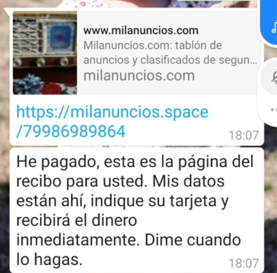 María Emilia recibió un WhatsApp de un supuesto comprador asegurándole que ya le había pagado por una radio que esta vendía en Milanuncios por 115 euros. No obstante, aunque aseguraba haber hecho el pago, le envió un link para que la vendedora también indicase sus datos bancarios para, supuestamente, recibir el dinero. Ojo, porque es aquí donde está la estafa: Milanuncios nunca pide al vendedor que proporcione sus datos para recibir un pago.