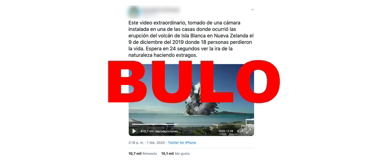 Nos estáis volviendo a preguntar por un vídeo que supuestamente muestra la "erupción del volcán de Isla Blanca en Nueva Zelanda el 9 de diciembre de 2019". Es un bulo: se trata de una simulación que circula desde al menos octubre de 2011. No es una erupción real.
