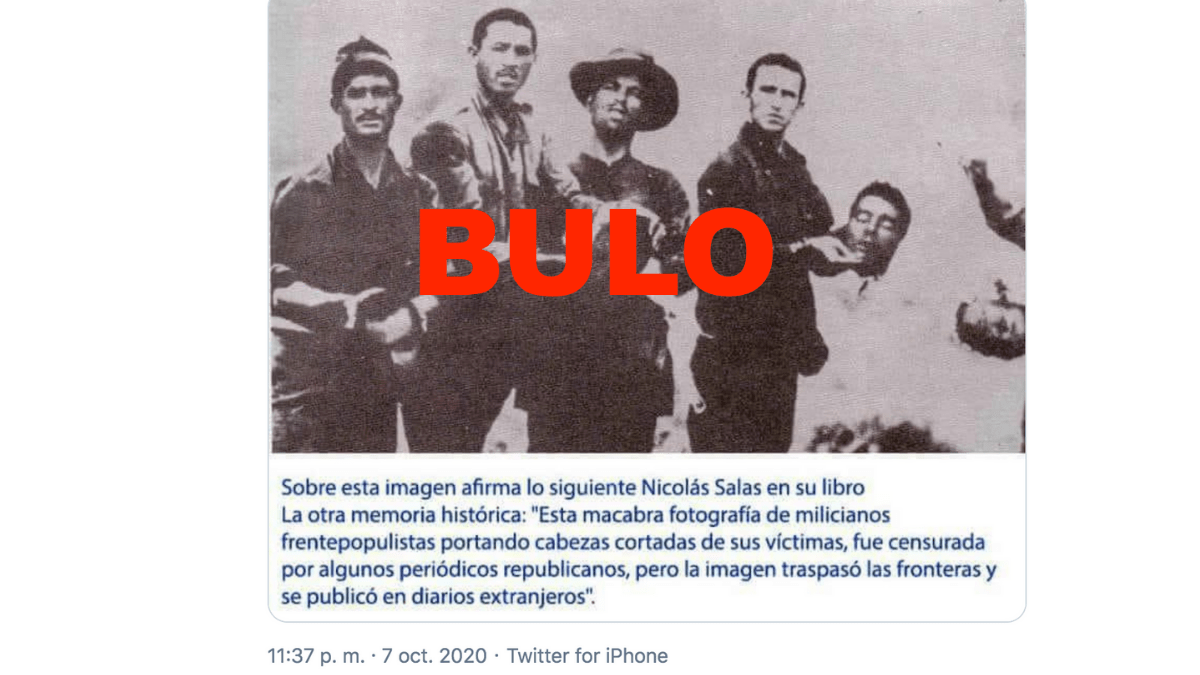 Está circulando en redes sociales una imagen a la que acompaña un texto atribuido al escritor y periodista Nicolás Salas, que dice que: “Esta macabra fotografía de milicianos frentepopulistas portando cabezas cortadas de sus víctimas, fue censurada por algunos periódicos republicanos, pero la imagen traspasó las fronteras y se publicó en diarios extranjeros”. Pero es un bulo, la imagen fue tomada en la Guerra del Rif y fue publicada nueve años antes del estallido de la Guerra Civil, en 1927.