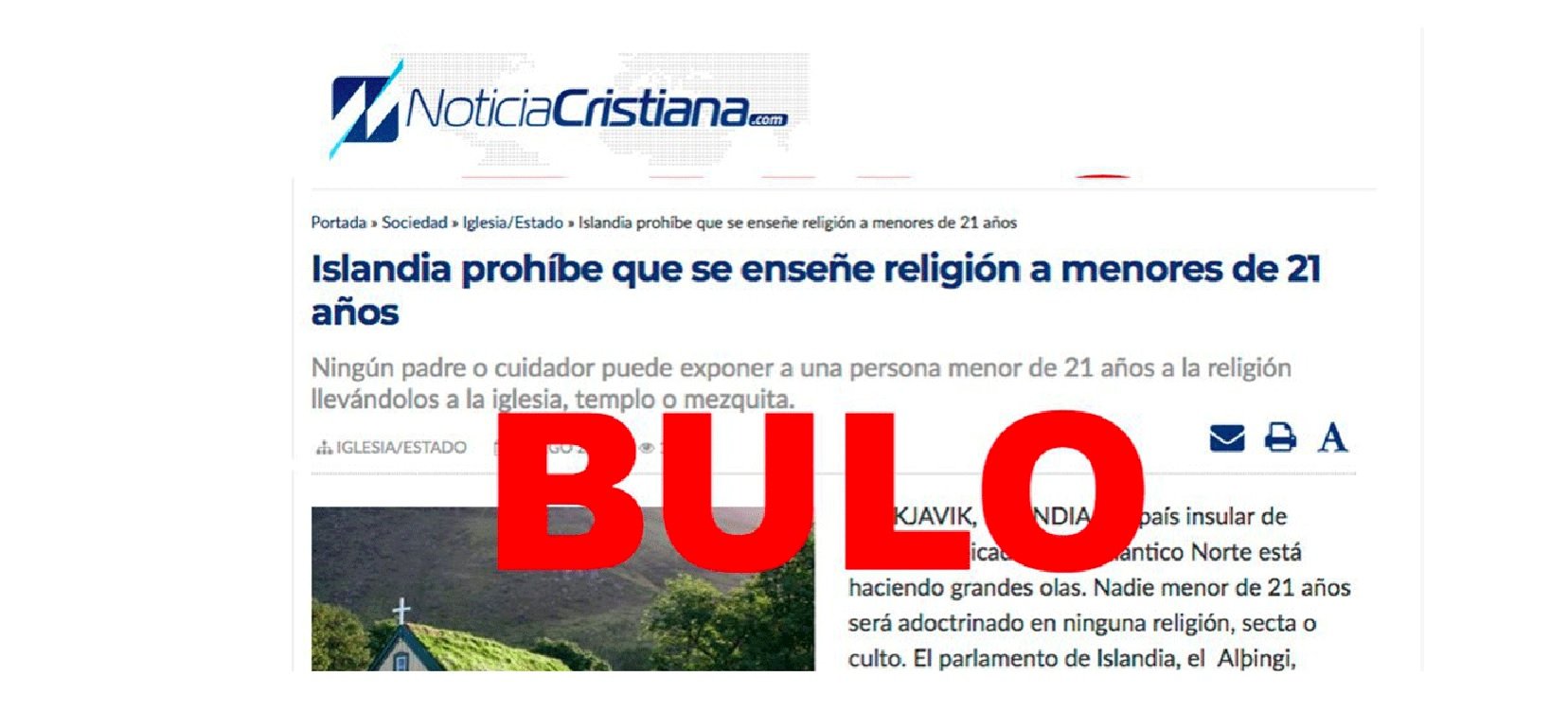 ¿Islandia prohíbe enseñar religión a menores de 21 años? Hace más de dos años se difundió un bulo que afirmaba que Islandia había prohibido enseñar religión o llevar a menores de 21 años a centros religiosos. Entonces ya os contamos que era un contenido catalogado por satírico por la web que lo difundió, ahora se vuelve a difundir como real.