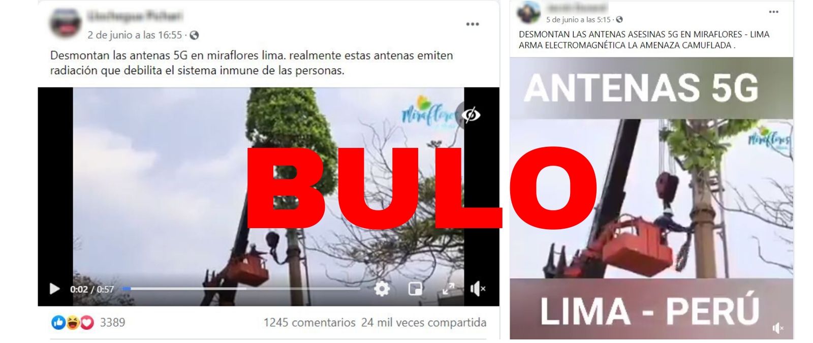 Los comentarios con los que se comparte el vídeo en redes sociales dicen que lo que están retirando es una antena 5G instalada en el distrito de Miraflores en la capital peruana. Pero, aunque el contenido se comparte como actual, las imágenes corresponden al desmontaje de una antena de telefonía que se llevó a cabo en noviembre de 2019. Así lo publicaron varios medios en Perú, como La República o RPP Noticias.