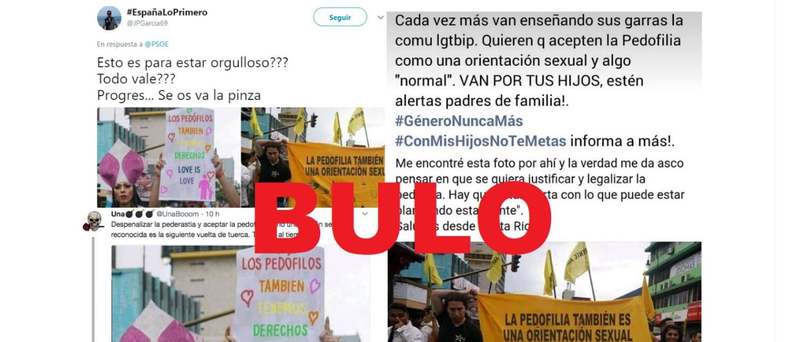Es un bulo que se ha movido por muchos países en un intento de atacar a la comunidad LGTBI acusándola de defender la pedofilia y las fotos se han atribuido a diferentes movilizaciones. Sin embargo, se trata de montajes realizados a partir de pancartas reales de la marcha por la diversidad en Costa Rica.