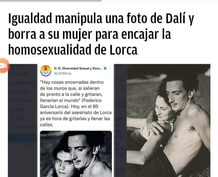 El organismo dependiente de la cartera que dirige Irene Montero publicó junto al fotomontaje una cita atribuida a García Lorca: “Hay cosas encerradas dentro de los muros que, si salieran de pronto a la calle y gritaran, llenarían el mundo”. “Hoy, en el 85 aniversario del asesinato de Lorca ya es hora de gritarlas y llenar las calles”, concluía el tuit, actualmente ya borrado pero que puedes ver en esta versión archivada. Para ilustrar la cita, la acompañaron de una imagen manipulada en la que se sustituye a Gala, la esposa de Salvador Dalí, por Federico García Lorca.