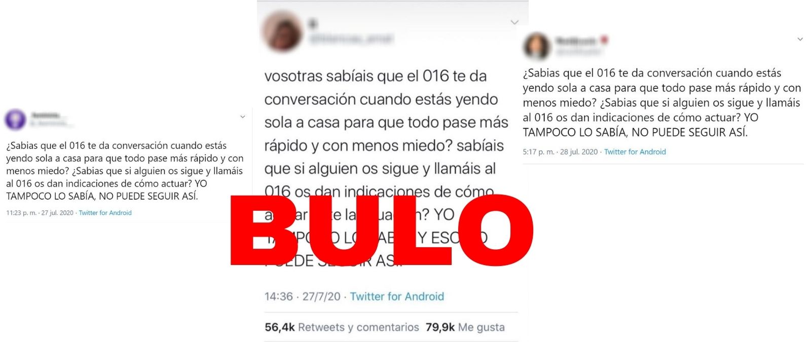 Está circulando un mensaje en Twitter que asegura que en el número de teléfono 016 "te da conversación" cuando vas sola hacia tu casa y que si alguien te sigue y llamas, te dan indicaciones sobre cómo actuar. Es un bulo. La actual delegada del Gobierno contra la Violencia de Género, Victoria Rosell, ha negado que esa información sea cierta ya que el 016 es un servicio de información y de asesoramiento jurídico en materia de violencia de género y no de acompañamiento a casa ni de emergencias.