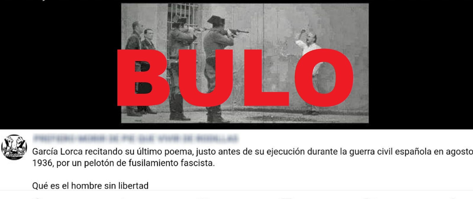 No existen imágenes del asesinato de Federico García Lorca por parte del ejército franquista. Esta imagen es un fotograma del videoclip de la canción 'Lágrimas de rabia' del grupo musical Boikot, publicado en su canal de YouTube en 2012 [min 2:14]. El supuesto fusilado es el actor Luis Fernández de Uribe.