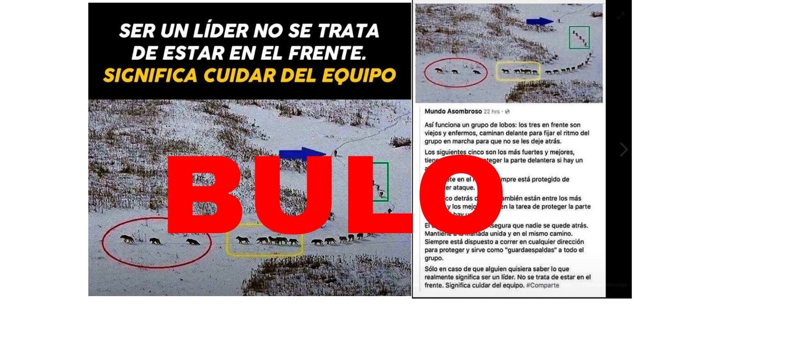 Se ha viralizado una imagen donde se puede ver a unos lobos que transitan a través de la nieve con la peculiaridad de que va uno detrás de otro. En la misma se dice que esta formación de la manada se debe a que "los 3 primeros son los viejos y enfermos", que marcan el ritmo para no quedar rezagados. "Los siguientes cinco son los más fuertes", que protegen al resto de un posible ataque y "el último es el líder", que mantiene unido al grupo para que nadie se quede atrás. Es un bulo. La imagen existe, aparece en el documental 'Frozen Planet' de la BBC, pero el comportamiento descrito en la imagen no se corresponde con la explicación de los expertos consultados por Maldita.es.