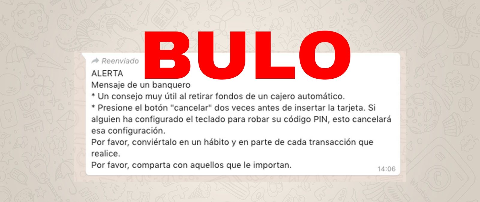 Circula una cadena de WhatsApp en la que dicen ofrecer "un consejo muy útil" de un banquero o un "técnico de computadoras de un banco" para llevar a cabo a la hora de sacar dinero de un cajero automático. Según el contenido, "si alguien ha configurado el teclado para robar su código PIN", podrás evitar el robo si presionas "el botón 'cancelar' dos veces antes de insertar la tarjeta", pues "cancelará la configuración". Es un bulo.