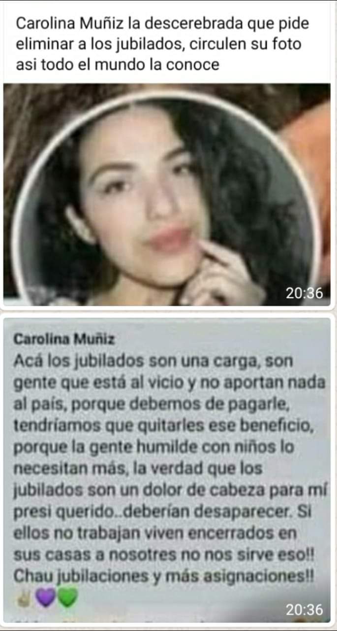 Nos habéis preguntado a través de nuestro chatbot de WhatsApp (+34 644 229 319) por una publicación de Facebook de una supuesta empleada de la clínica El Molinón (Gijón), llamada Carolina Muñiz, en la que se asegura que los “jubilados son una carga”, que “tendríamos que quitarles” las pensiones y que “deberían desaparecer”. Es un bulo: se trata de un comentario de otra persona llamada Carolina Muñiz publicado en respuesta a una noticia sobre la deuda en Córdoba (Argentina). La clínica El Molinón ha publicado un comunicado negando que sea su empleada.