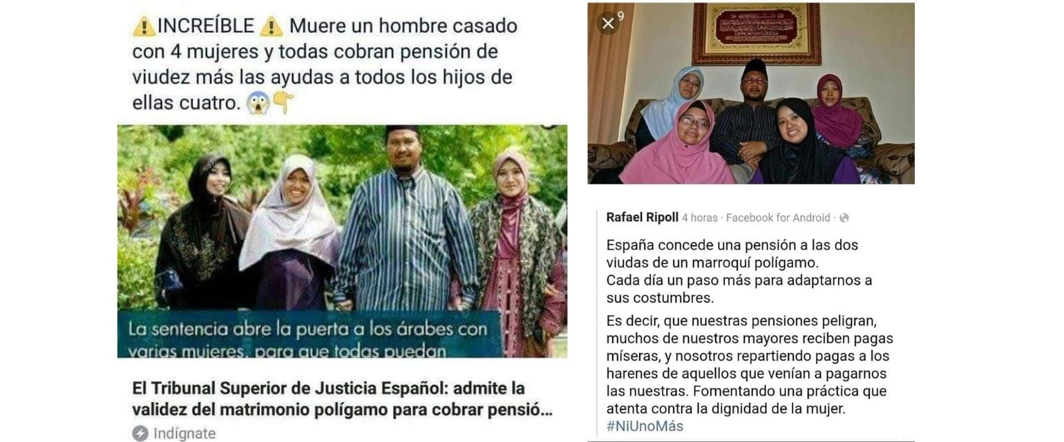 Nos habéis preguntado a través de nuestro número de WhatsApp (+34 644 22 93 19) por dos imágenes en las que aseguran, por un lado, que "muere un hombre casado con 4 mujeres y todas cobran pensión de viudez más las ayudas a todos los hijos de ellas cuatro" vinculando como fuente al "Tribunal Superior de Justicia Español" (foto de la izquierda) y, por otro, que "España concede una pensión a las dos viudas de un marroquí polígamo" (foto de la derecha).