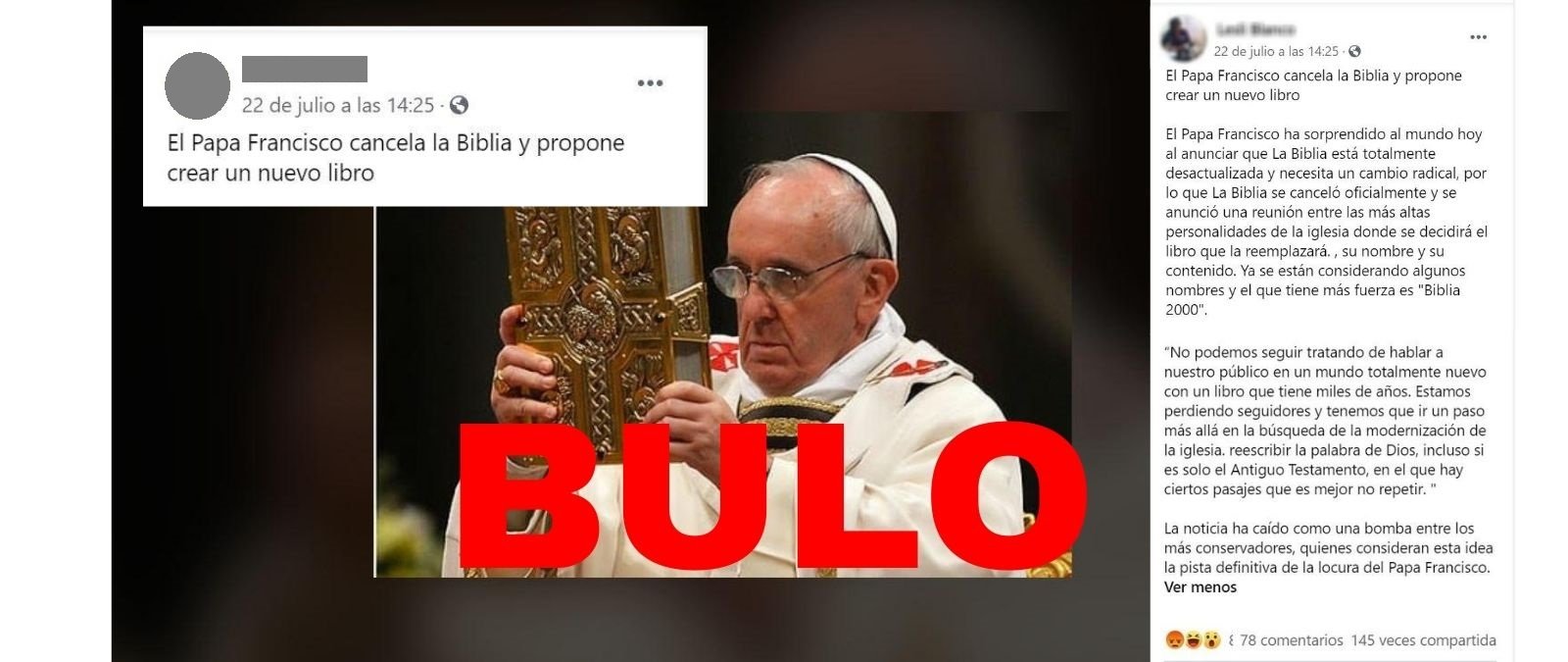 Se está compartiendo un contenido en Facebook que afirma que el papa Francisco "cancela la Biblia" por estar desactualizada y "propone crear un libro nuevo". Es un bulo. El texto sale de una web satírica que lo publicó en 2017 y ahora se comparte como si fuera real.