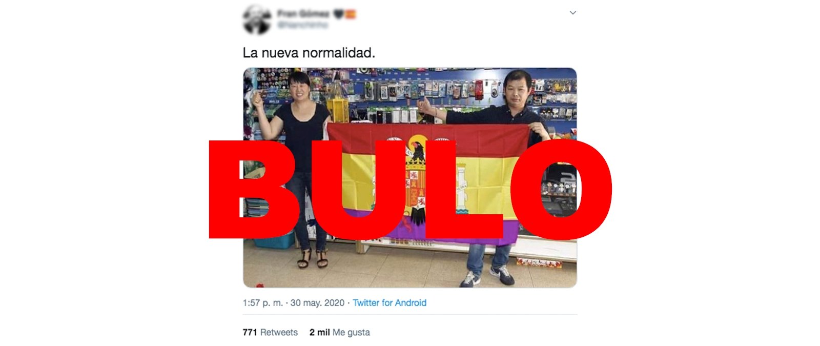 Vuelve a circular una imagen de dos personas que sujetan una bandera con los colores de la bandera de la Segunda República Española y con el escudo del Águila de San Juan de la bandera preconstitucional franquista. Es un bulo, se trata de un montaje.